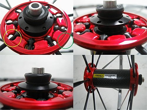 上圖左上黃色圈圈處是SL在穿輪幅的時候的工作孔、右圖是所謂的加勁環,在很久以前,曾經SL的鼓耳有拉裂的情形,所以後來的加勁環做的厚也比較大,再來前輪的軸承曾經有兩種規格,我依稀記得是6903跟6900,應該是年份不同,很久沒去玩這個了所以不是很清楚,請原諒小弟記憶力並不好。此外更值得一提的就是他的直拉式鋁輪幅,這個鋁輪幅應該是退火過的鋁材,非常的軟Q,我曾經拿了一支客人斷掉的輪幅看電視一直折一直折一直折一直折,過了一個小時依舊健在,想拿來掏耳多也不好用因為太粗了,關於"粗"這個話題我先賣個官子,到了後輪再來討論這個議題。